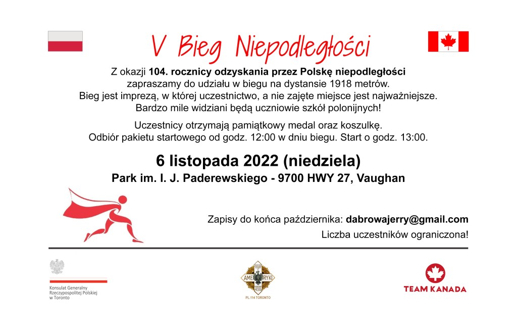 Z okazji 104 rocznicy odzyskania przez Polskę niepodległości zapraszamy do udziału w biegu na dystansie 1918 metrów. Bieg jest imprezą, w której uczestnictwo, a nie zajęte miejsce jest najważniejsze. Bardzo mile widziani będą uczniowie szkół polonijnych!
